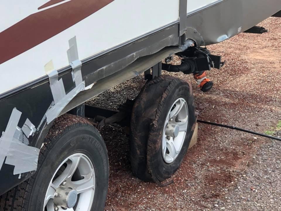 After slowing and safely pulling the rig over onto the shoulder of the highway, I did an inspection. As the tire came apart, its shredded debris caused quite a bit of damage to the side of the trailer and the plumbing connections underneath. I obviously needed to change at least one tire, and then do some road-side repairs (involving duct tape and baling wire) to make the trailer road worthy. However, a second tire had an easy-to-see hole in the tread and exposed steel belt. I now needed two tires, and had only one spare.