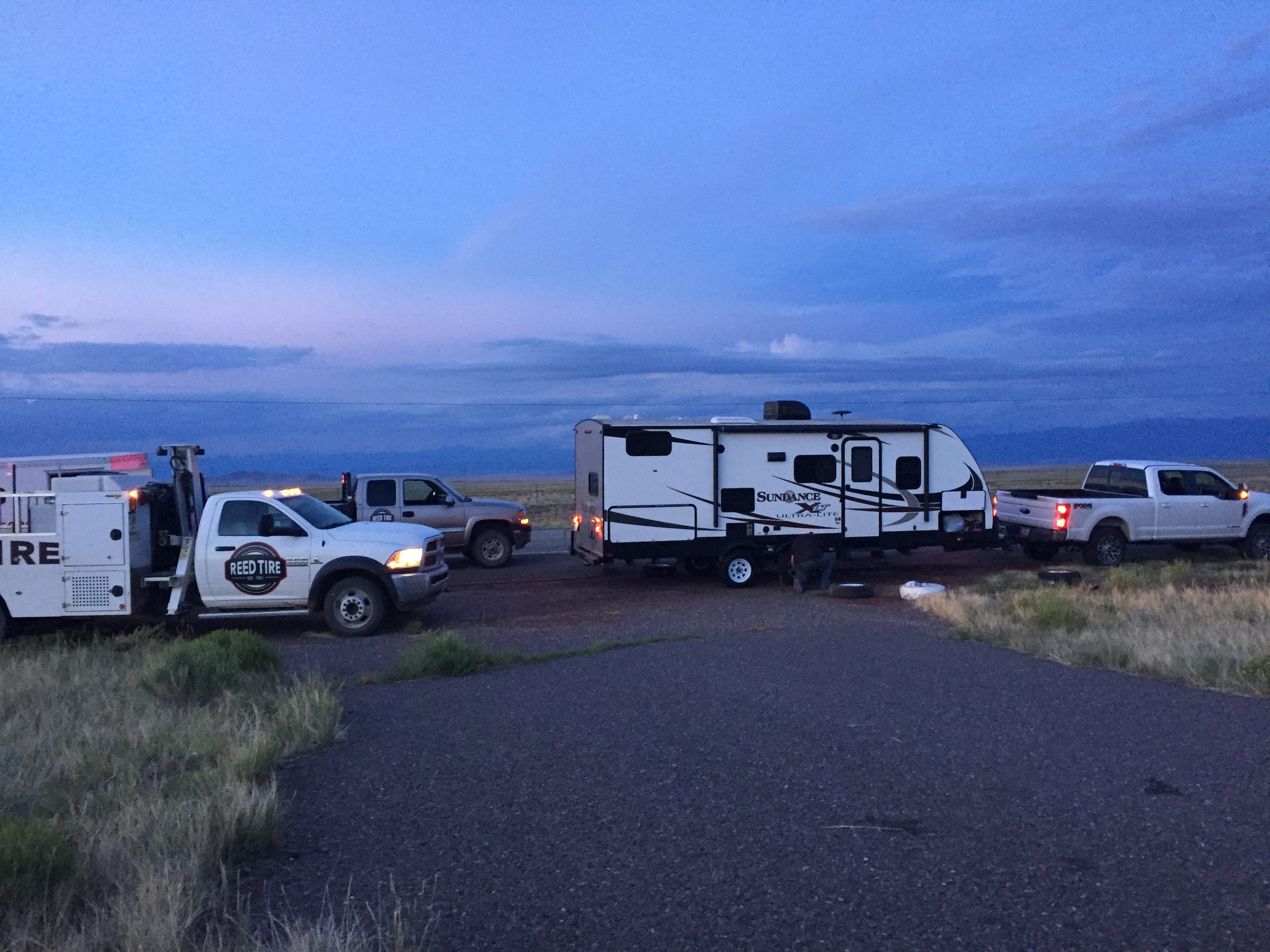 Next on the search was a company called Reed Tire (reedtire.net) in La Jara, Colorado, some 20-30 miles away. According to their published hours, they had closed at 5 pm, but I called anyway and to my great delight a gentleman named Brad answered instantly. I told him about my blowout, where I was, and that I was looking for two ST205 75R14 tires. Brad dispatched a colleague named Mitch, who was onsite in 20 minutes flat.